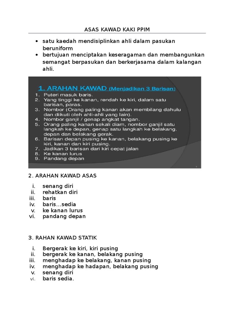 - tidak melebihi 20 ahli 1. Arahan dan perlakuan bagi Asas Kawad Kaki 1. Di bawah ini terdapat beberapa pergerakan dalam asas perbarisan.